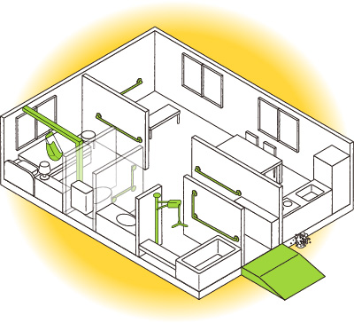 てすり取付、扉の交換、滑り防止のための床材の変更、段差解消(スロープ設置や床上げ床下げ等)、浴槽改修、トイレ改修、ユニットバス設置、洗面台の流し改修、洗面台改修、その他介護保険適応付帯工事